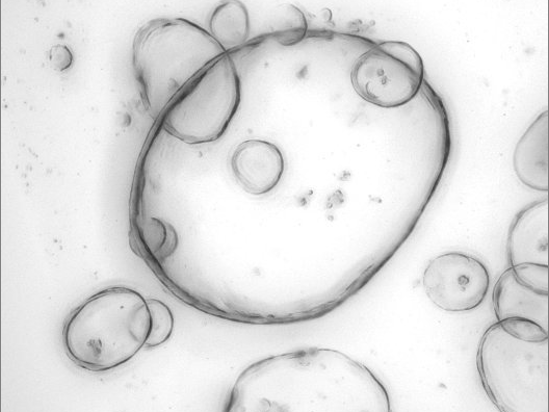 Mikroskopische Abbildung von im Labor kultivierten, Patienten-abgeleiteten Pankreasorganoiden. Maßstab: 250 µm. (Bildnachweis: Kaja Wächtershäuser, Nadine Weinelt (AG van Wijk)).