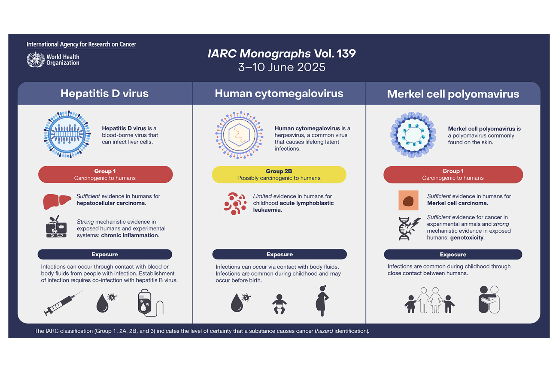 Im Juni 2025 hat die Internationale Agentur für Krebsforschung (IARC), eine Einrichtung der WHO, die krebserregende Wirkung von drei Viren im Rahmen ihrer neuen Monographie 139 bewertet: dem Hepatitis-D-Virus, dem Merkelzell-Polyomavirus sowie erstmals dem humanen Zytomegalievirus (HCMV).