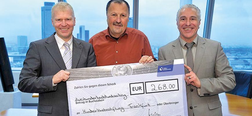 from left: Jürgen Kalisch (IT Consultant Verbund Management), Rudolf Starck (Managing Director of the Frankfurt Foundation for Children with Cancer) and Michael Müller (Purchaser) The employees came third in Union Investment’s in-house football tournament and presented the manag…