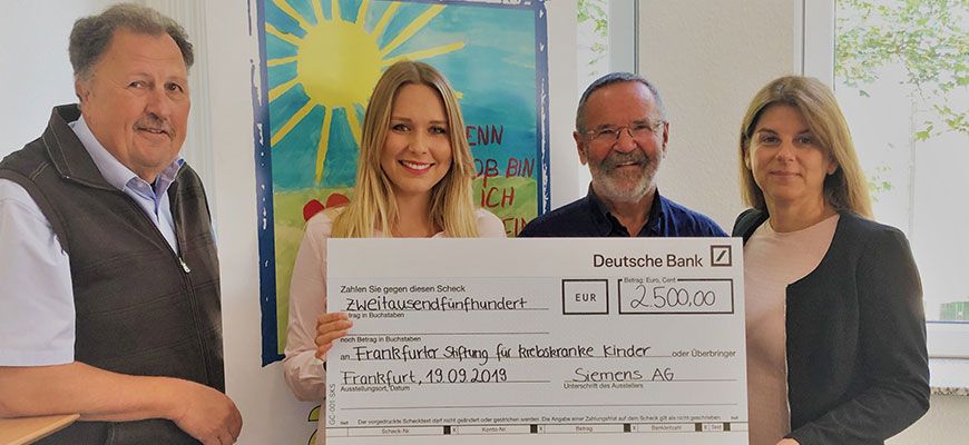 Frau Miriam Erben (2.v.l) und Frau Carola Schönbrunn (4.v.l.) von der Siemens AG überreichten unserem Geschäftsführer Herrn Rudolf Starck (1.v.l.) sowie dem Vorsitzenden der Frankfurter Stiftung für krebskranke Kinder, Herrn Dr. Jürgen Vogt (3.v.l.), einen Scheck in Höhe von 250…