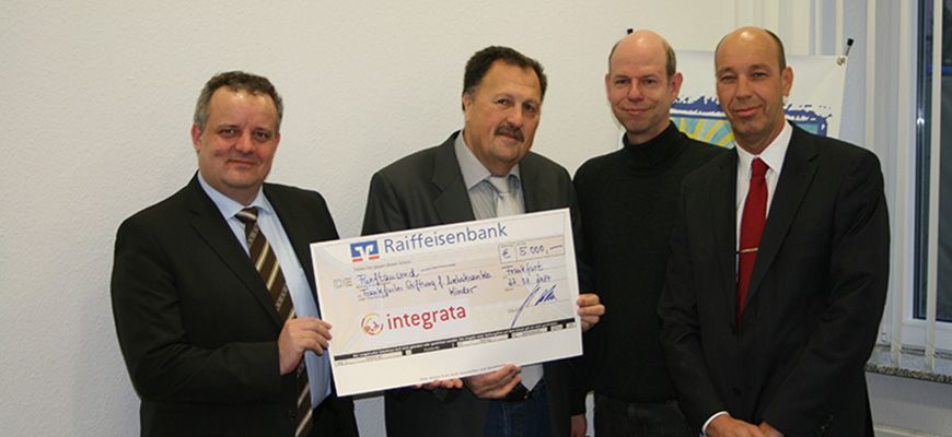 von links: Jonas Leifhelm (Geschäftsstellenleiter Frankfurt der Integrata AG) Rudolf Starck (Geschäftsführer der Frankfurter Stiftung für krebskranke Kinder), Dr. Jens-Uwe Vogel (Arbeitsschutz & Wissenschaftsmanagement der Frankfurter Stiftung für krebskranke Kinder) Dr. An…