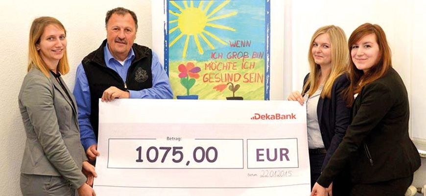 DekaBank trainees present a cheque for €1075 to the Frankfurt Foundation for Children wit…