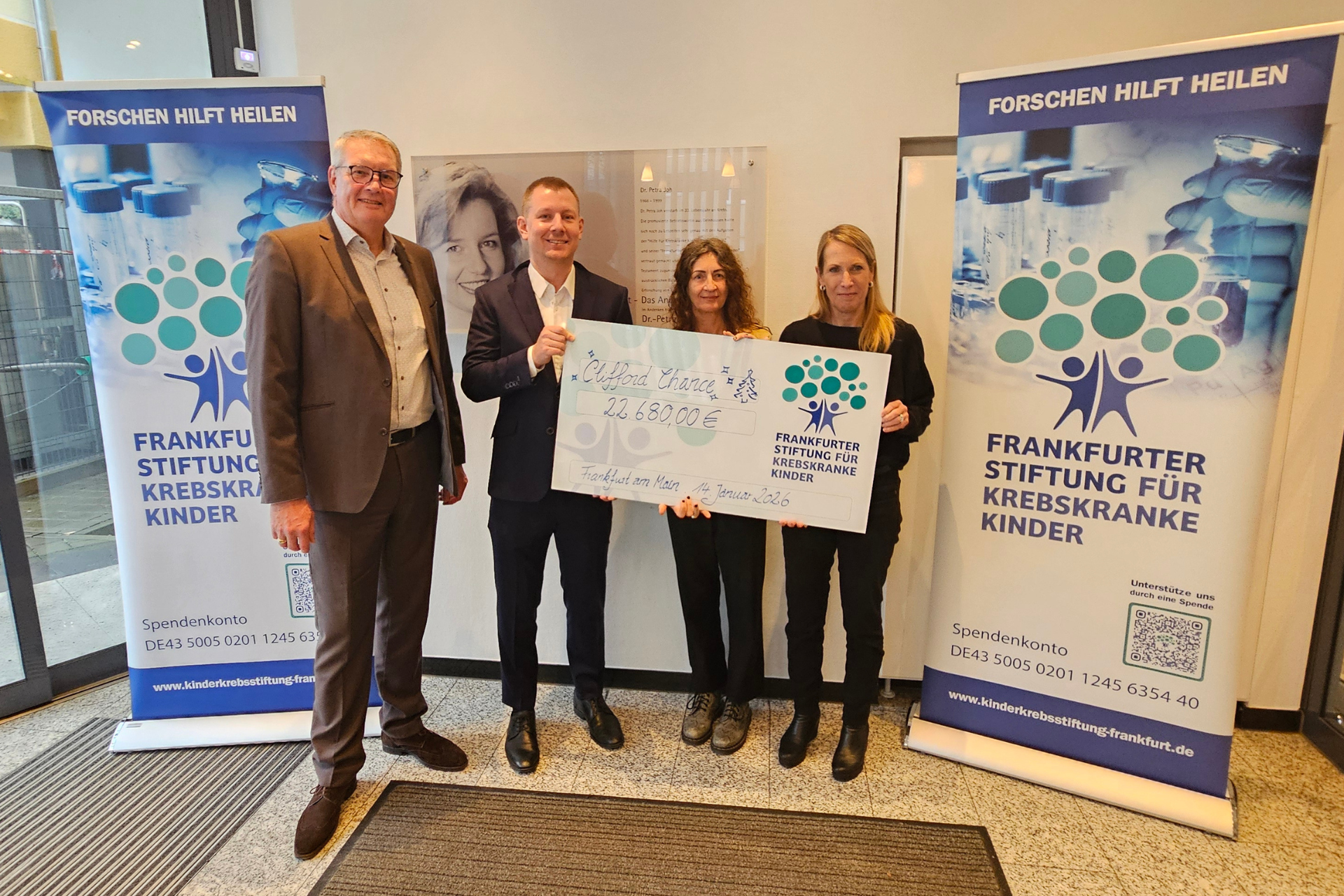 Die Frankfurter Stiftung für krebskranke Kinder freut sich sehr über die Weihnachtsspendenaktion von Clifford Chance. Mit unglaublichem Engagement haben sich die Mitarbeitenden und das Unternehmen an der Spendeninitiative beteiligt – für die Zukunft krebskranker Kinder.